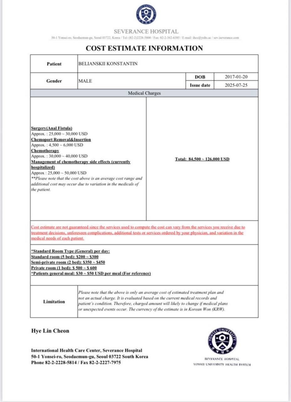 Сейчас Костя снова в онкологическом отделении 🛏️ Лечение продолжается… Но клиника выставила новый счёт: 126 000 долларов 💰 Почти 10 миллионов рублей 💸 У нас этих денег просто нет…