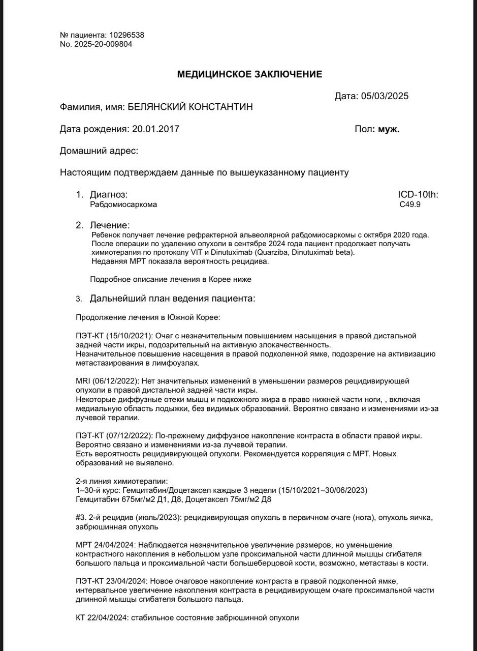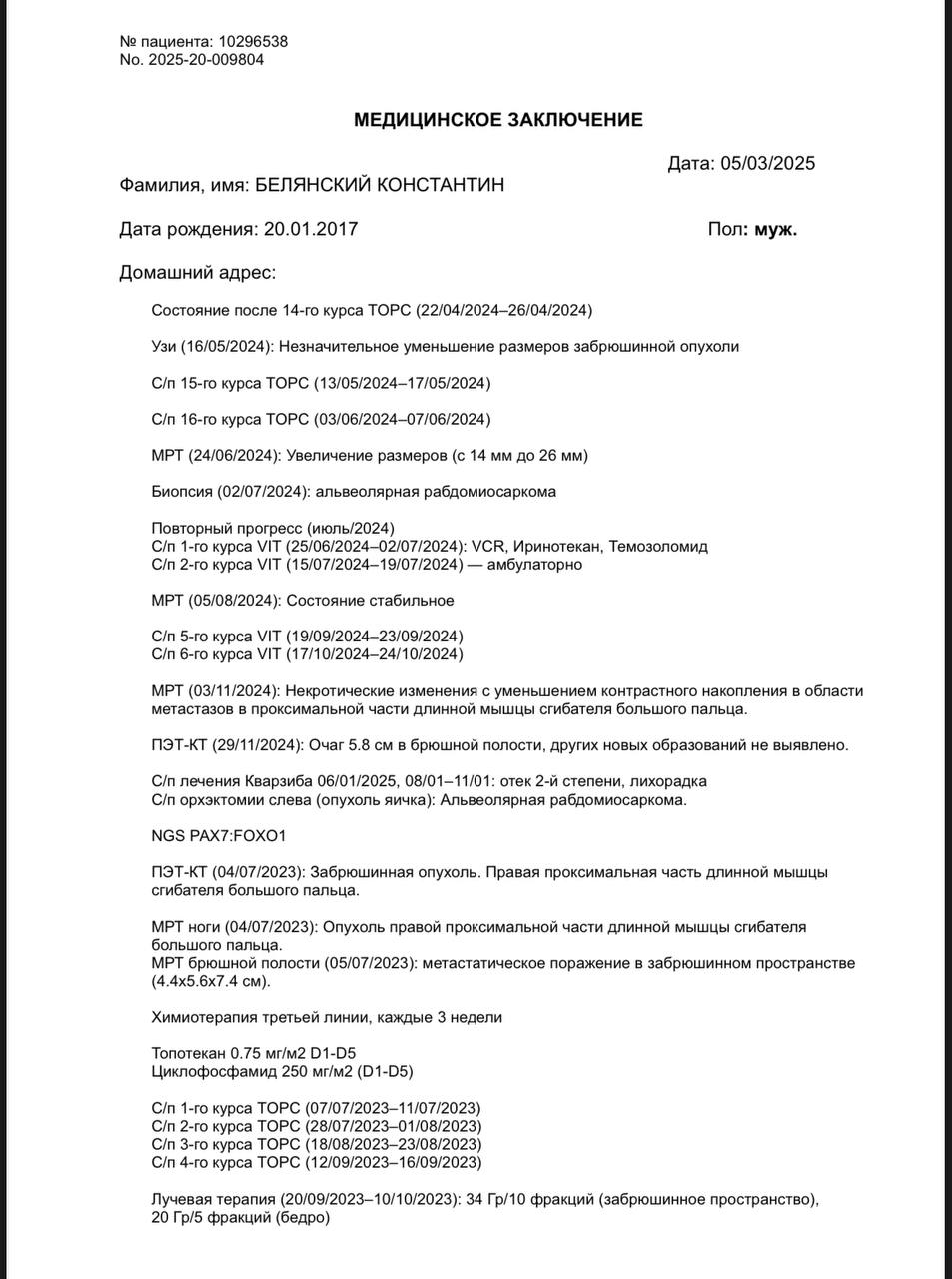 Рабдомиосаркома 🧠 — редкая, агрессивная опухоль. Поражена правая голень 🦵 Мутация PAX7-FOXO1. Как приговор, написанный в клетках… Врачи разводили руками 🧤 — таких, как он, почти не спасают.