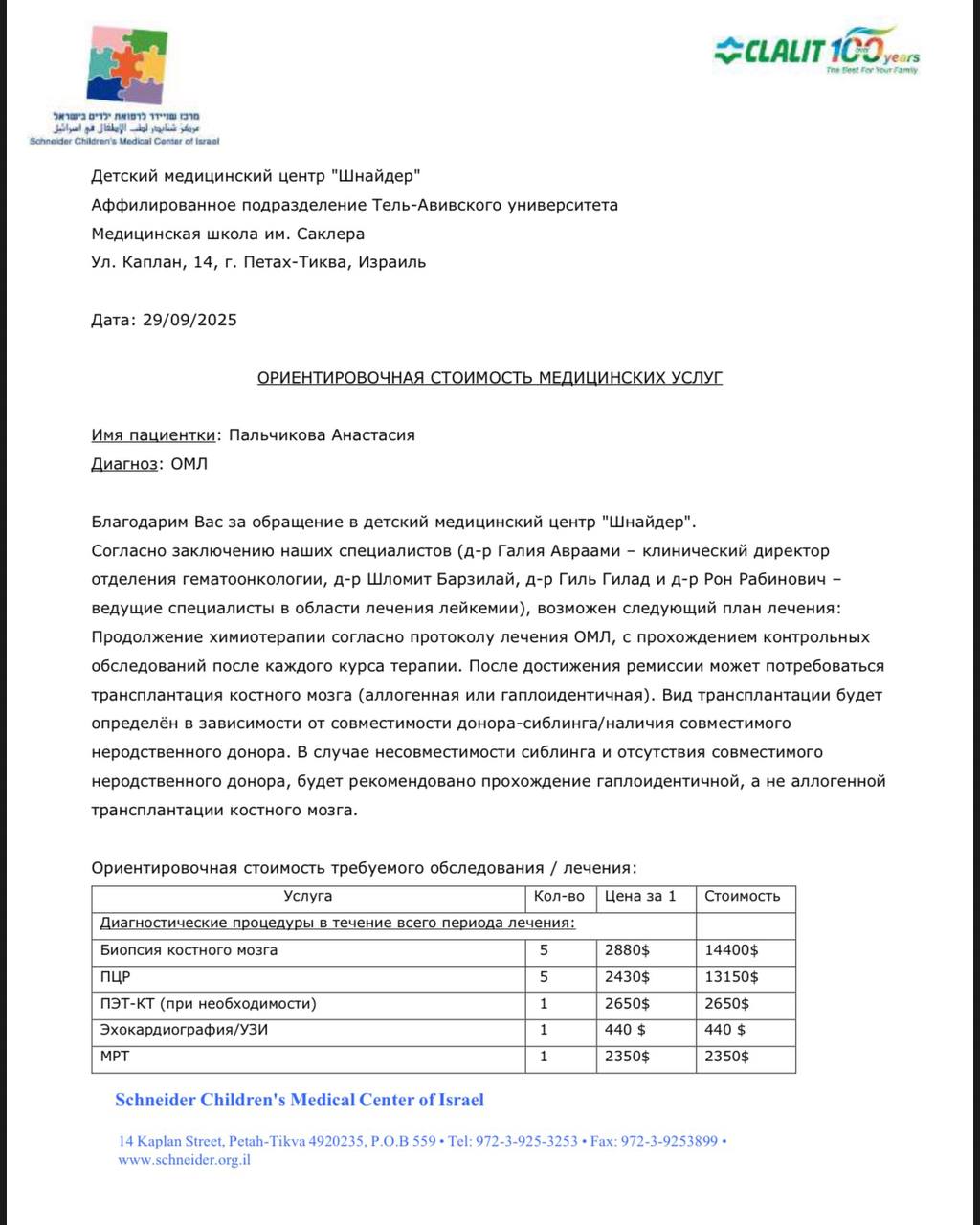 Израильская клиника «Шнайдер» 🇮🇱 готова принять нас и продолжить лечение 🙏.