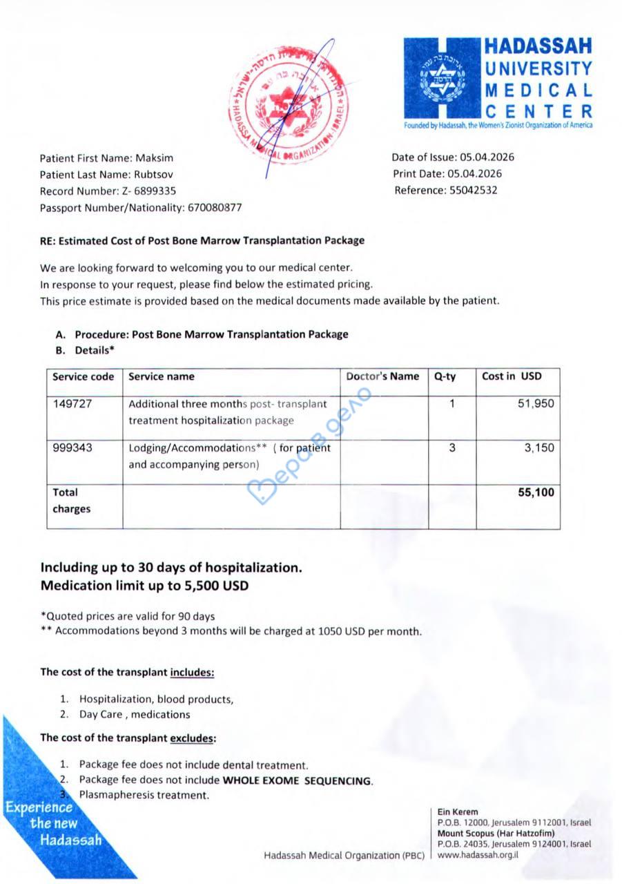 Сейчас ему необходимо лечение в клинике «HADASSAH» в Израиле.