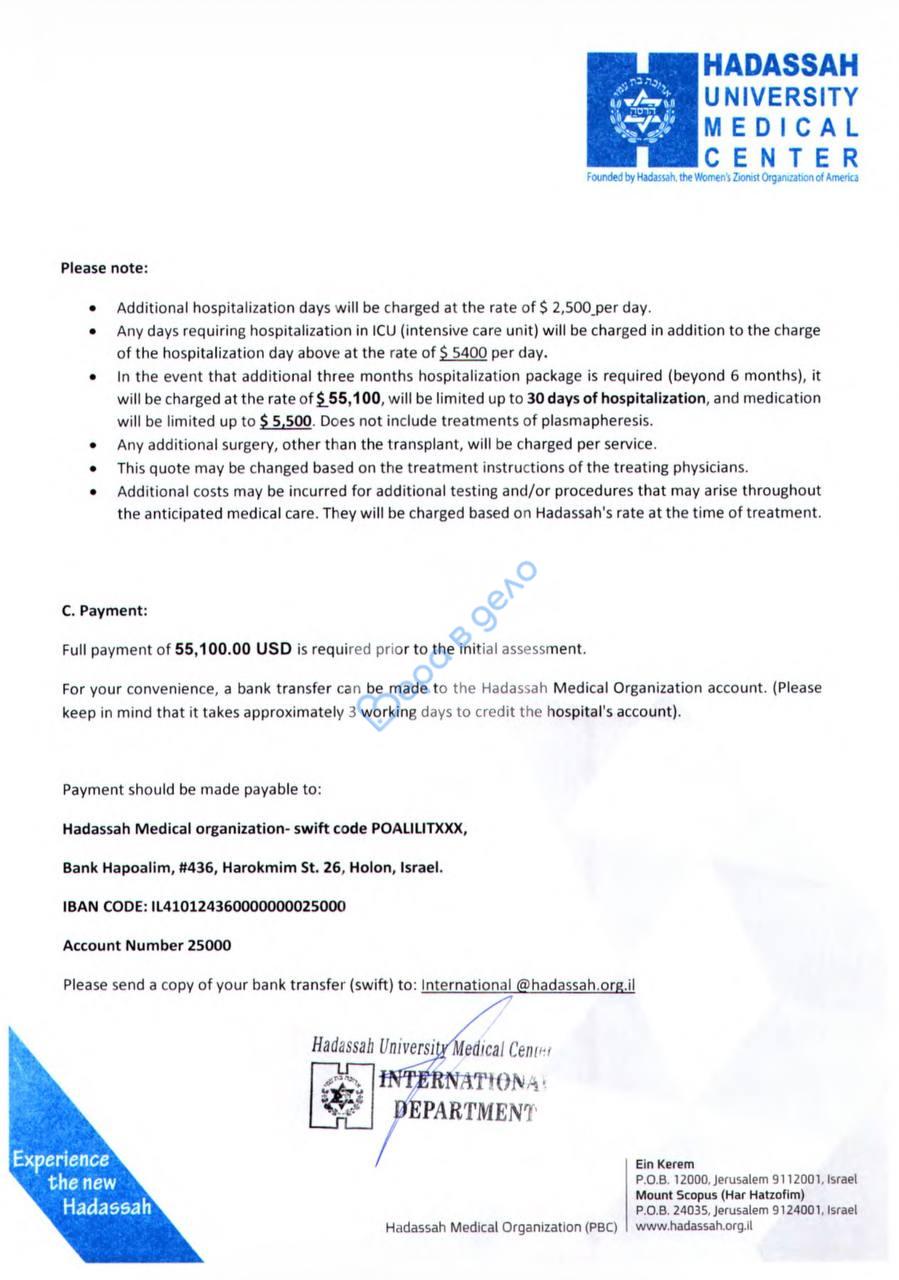 Требуется срочное лечение в клинике в Израиле "HADASSAH"