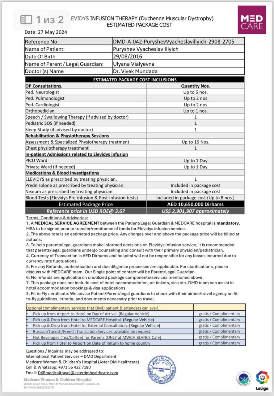 Но есть шанс! 🙏 Препарат Элевидис — единственная надежда, которая может остановить прогрессирование болезни и подарить Славе шанс на нормальную жизнь. 💖 Но его стоимость неподъемна для нашей семьи: 2.885.000р. Мы не можем собрать такую сумму без вашей помощи. 😢