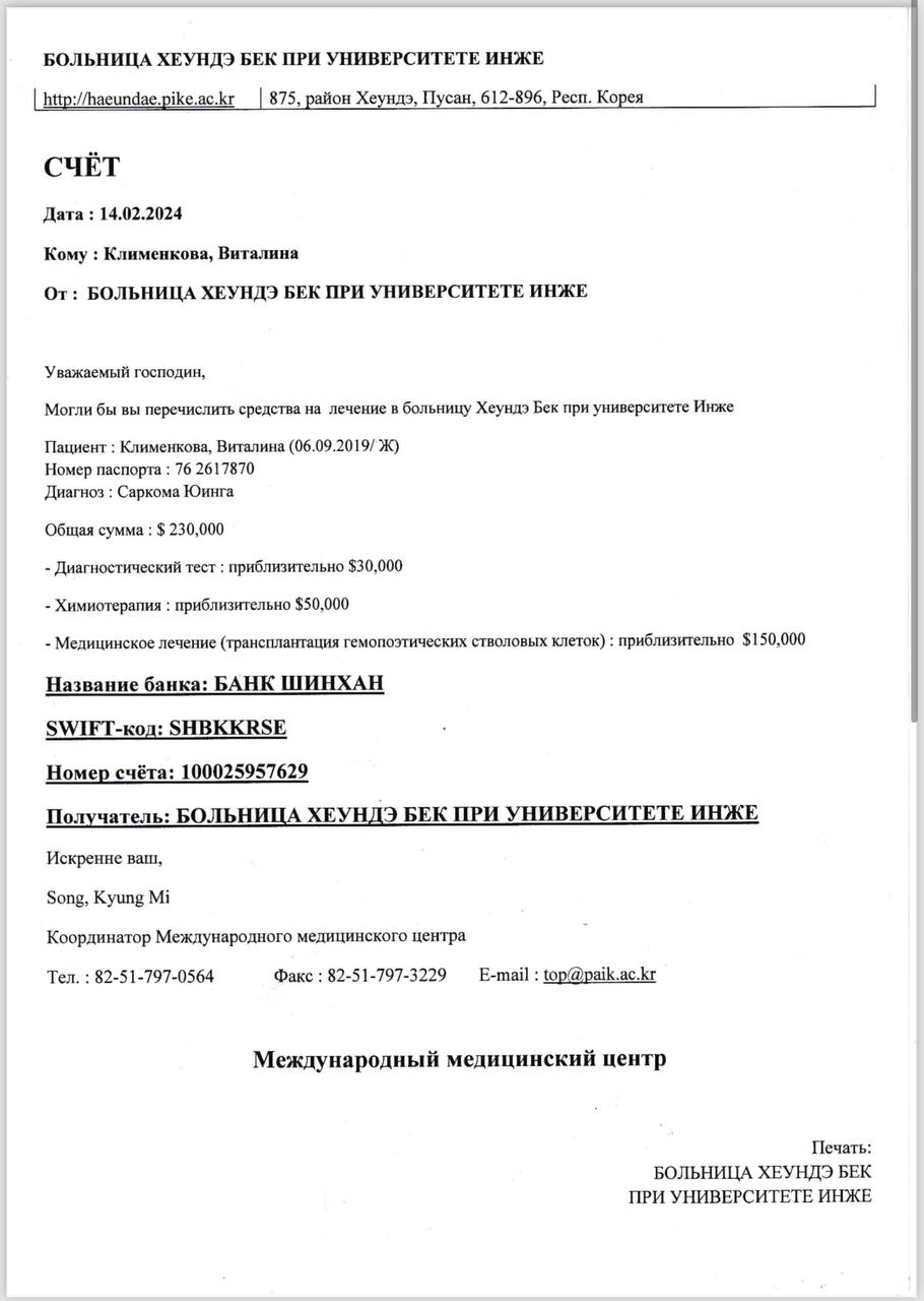💗😭Моя дочь сгорает от рака! В ее юном возрасте стоит вопрос жизни и смерти. Каждый день для доченьки, это игра, в которой главный приз это ЖИЗНЬ! Моя доченька родилась здоровой, красивой и умной девочкой, все было хорошо пока нашу жизнь не разделило на до и после. В ее жизни появился рак, который начал в усиленном темпе прогрессировать и забирать все силы. Изначально мы начали замечать, как Виталине становилось плохо. жар, тошна, боль в костях особенно когда занималась физкультурой. Мы обратились к врачу, где у нас сразу же взяли все анализы и направили к онкологу. Там выявили страшное, из-за чего я упала в обморок. У моей дочери выявили «Саркома Юинга». Нам назначили в лучшей больнице в РФ – ФГБУ НМИЦ ДГОИ им. Дмитрия Рогачева. К огромному сожалению, нам там не помогли и сказали, что они тут бессильны и просто отправили доживать последние дни жизни. Мы не опустили руки и начали искать клиники, где работают с данным видом опухоли, к нашему счастью, мы нашли клинику в Южной Корее, где сейчас проходим лечение в больнице Inje University Haeundae Paik Hospital. Сейчас мы прошли уже 4 блока химеотерапии из 6 запланированных. После 2 блока химии опухоль уменьшилась в 2,5 раза. Стоимость 1 дня в реанимации составляет 450тыс. руб. Сейчас практически все накопленные средства ушли на реанимацию и денег просто нам не хватает, возможности собрать нужную суммы у нас нет. Мы делаем все что есть в наших силах. Сейчас выставили счет в сумме 2.155.000 руб. мы просим всех неравнодушных людей помочь нам. ваша помощь сможет спасти жизнь.❗