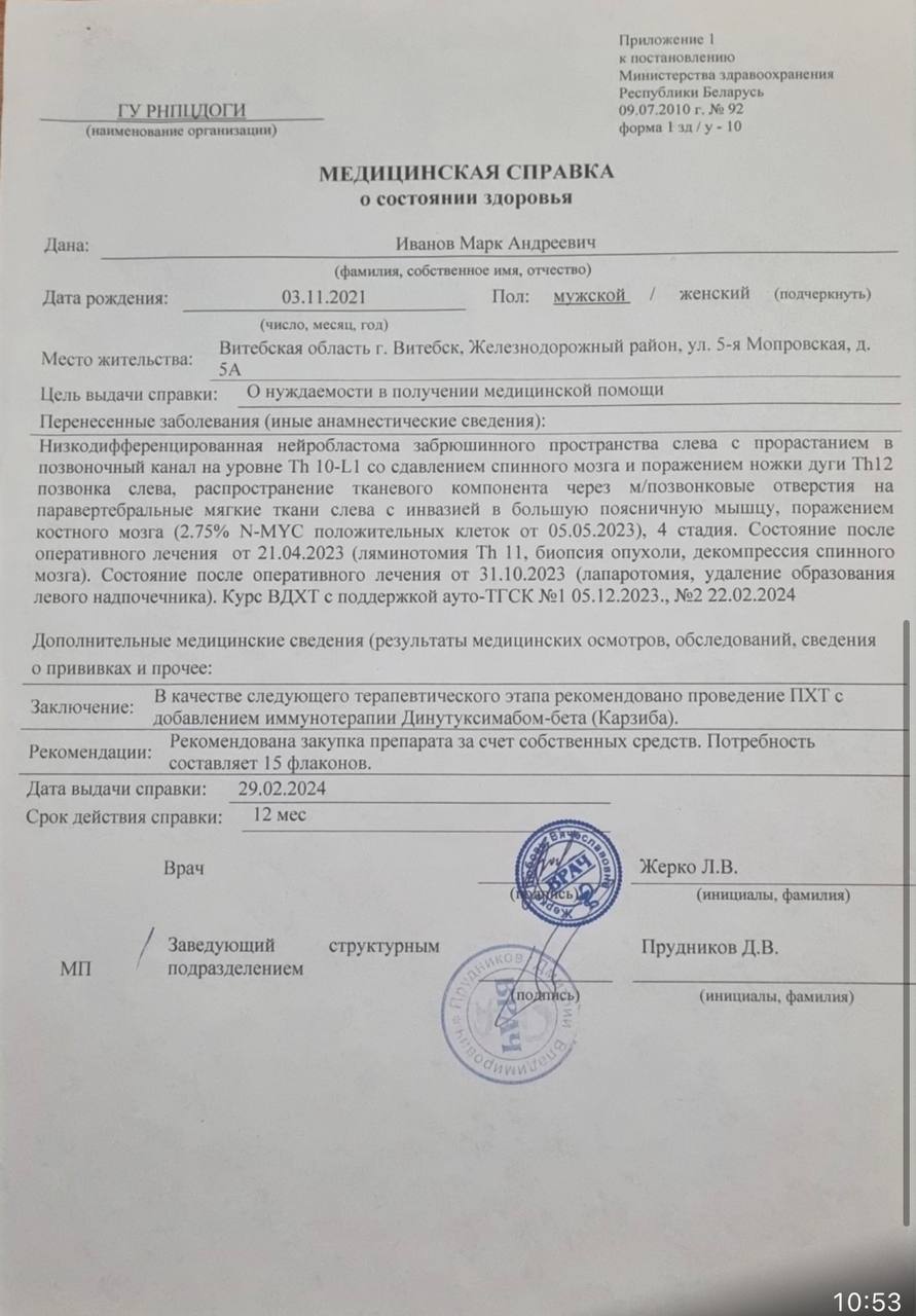 Наш сын снова оказался лицом к лицу с этой ужасной болезнью 😢. И теперь у него есть только один шанс на жизнь — дорогостоящее лекарство под названием “Динутуксимаб” 💊.