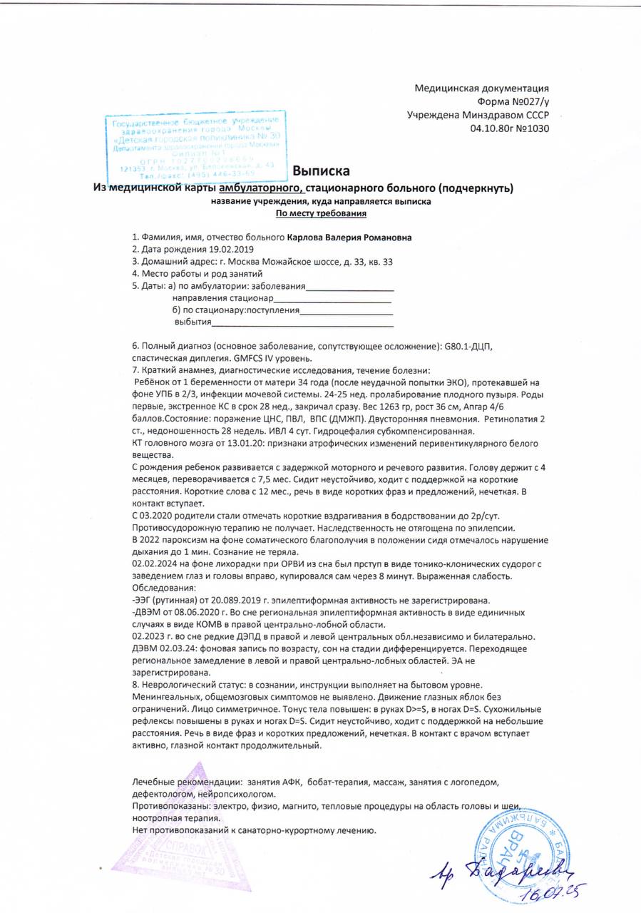 У нас нет права на паузу ⏳. ДЦП не ждёт. Эта болезнь не останавливается. Каждый перерыв — откат назад 🔁. А я одна. В разводе. Две дочери 👩👧👧. Ипотека. Кружки. Аптека. Центр «Развитие» согласен взять нас на курс, но сумма неподъёмная — и мне неоткуда её взять 🧾.
