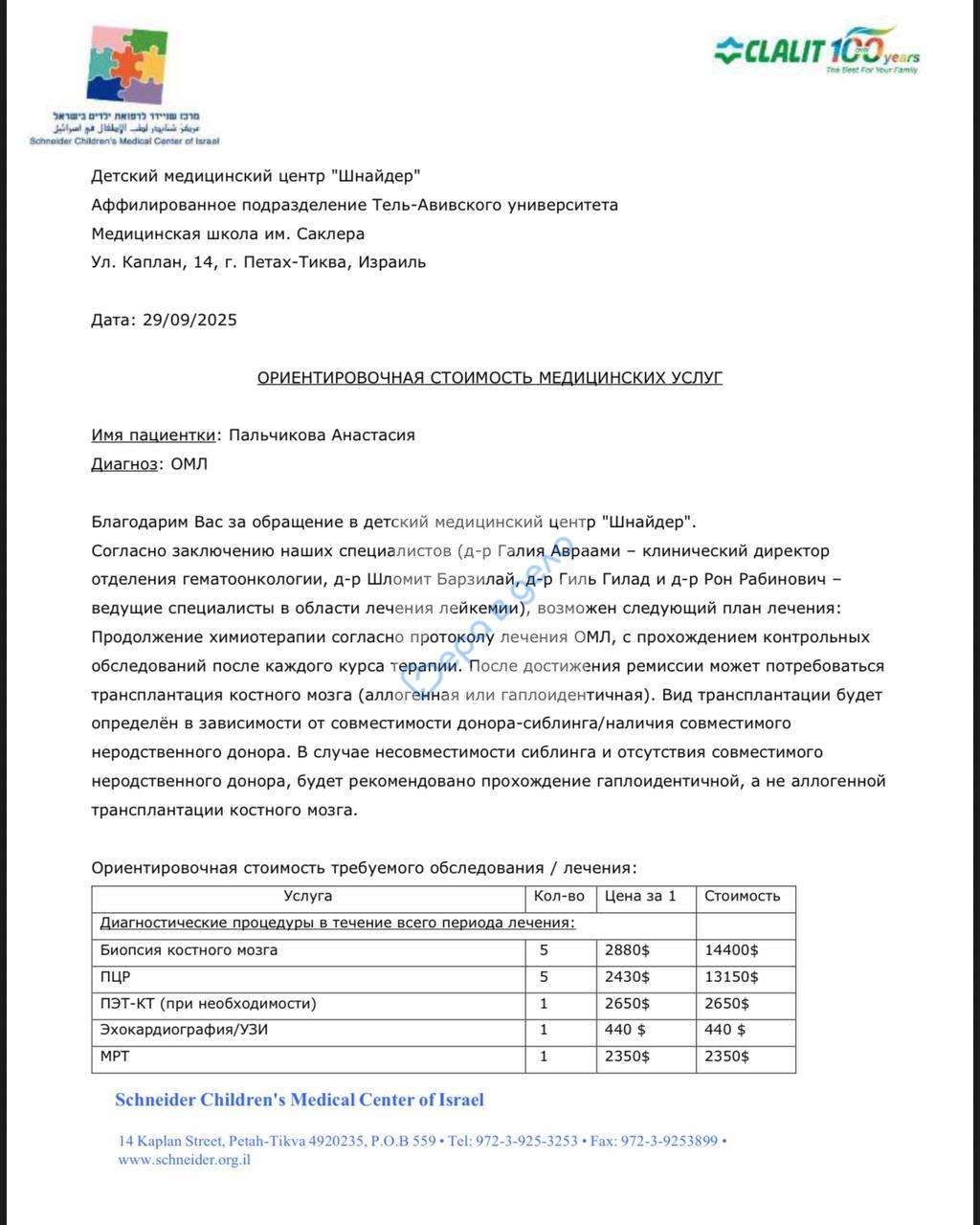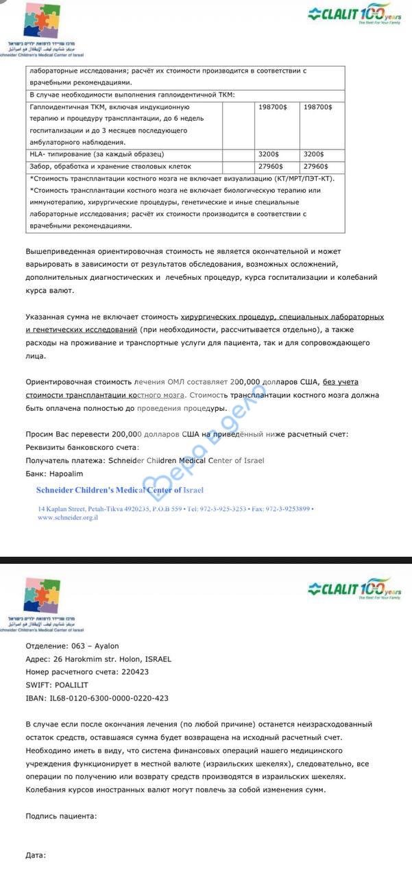 Израильская клиника «Шнайдер» 🇮🇱 готова принять нас и продолжить лечение 🙏.