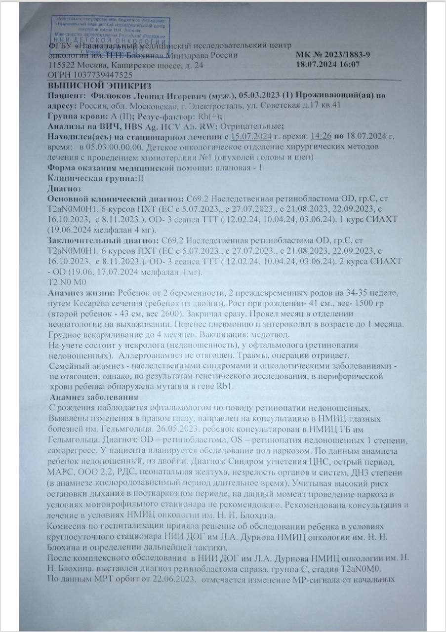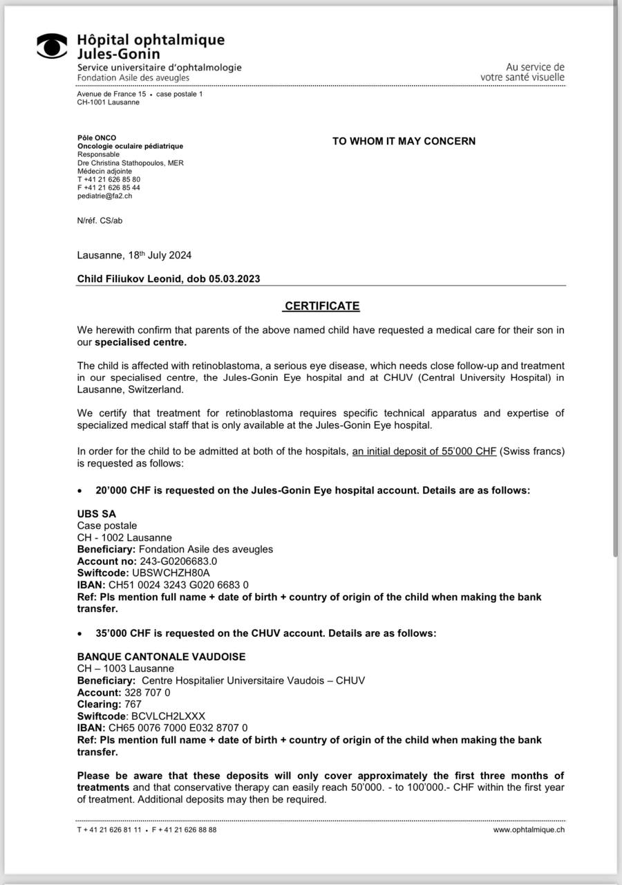 Нам предложили удаление глазика, но мы не можем сдаться, не можем просто так отпустить нашего мальчика. Мы нашли клинику в Швейцарии, где могут помочь, где есть оборудование для послойного осмотра сетчатки, что даст шанс обнаружить рецидивы на ранней стадии и применить нужное лечение. Но стоимость лечения — 2.185.000 рублей — для нас неподъемна. 😭💔