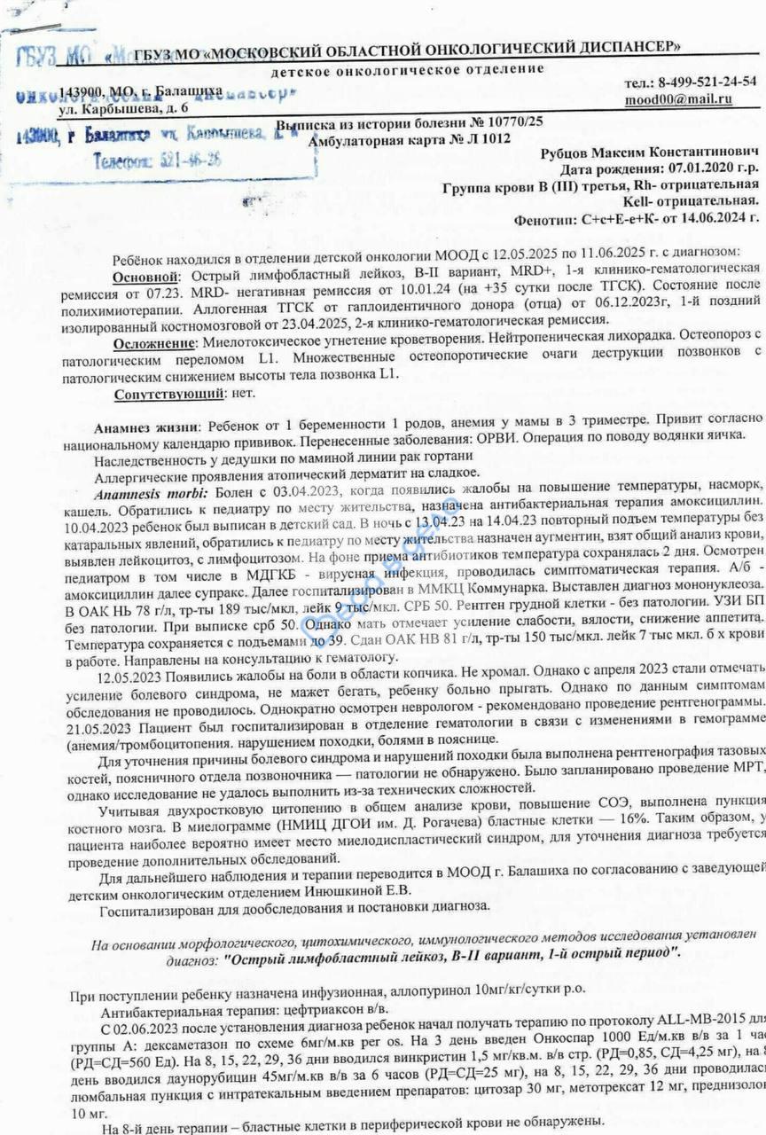 Острый лимфобластный лейкоз (рак крови).