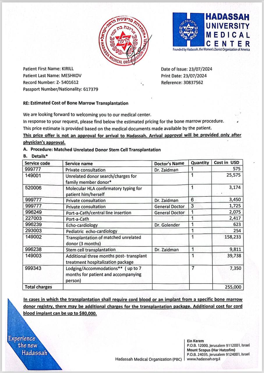 🆘👱‍♀️ Я кричу о помощи! Жизнь Кирюши обречена. Рак сжигает сына изнутри! Времени нет! Всем добрый день, я мама своего маленького ангела Кирилла. Мой малыш родился здоровым мальчиком, как говорили Богатырь. Он очень любил жить, радоваться разным веща, играть с водой и считать ступеньки каждый раз, когда поднимался или спускался. Но как-то в один день он стал жаловаться на свое самочувствие, постоянный жар, головокружение и сонливость. Я незамедлительно обратилась к врачу, врач нам сказала сдать анализы и приходить с результатом к ней обратно. После сдачи нам уже сказали, что у моего сына «Острый лимфобластный лейкоз Т- IV». У меня ушла земля из под ног, я не могла даже подумать, что это произойдет с моим сыном. Я не могла не спать, ни есть, вообще ни чего. Сейчас мой сын лежит в больнице, ему проводят курс химеотерапии, самочувствие находится в критическом состоянии. Показатели крови падают и сводятся почти к нулю. Сейчас нам предлагают химиотерапию ФЛАИ, очень высокой концентрации, для того чтобы нас наконец то вывести в ремиссию. Если это случится нас ждёт пересадка в Израиле в клинике Hadassah от неродственного донора. Нам дали счет и сумма очень большая 2.700.000 руб. Сама такую сумму я не смогу потянуть, я прошу вас, ради Бога, помогите нам. Ваша помощь нам очень нужна.💙