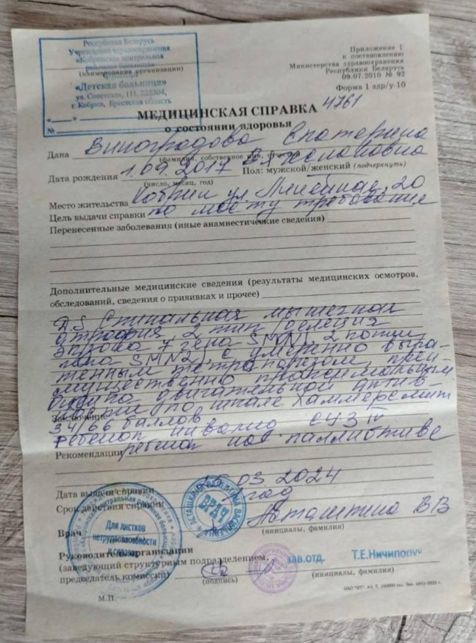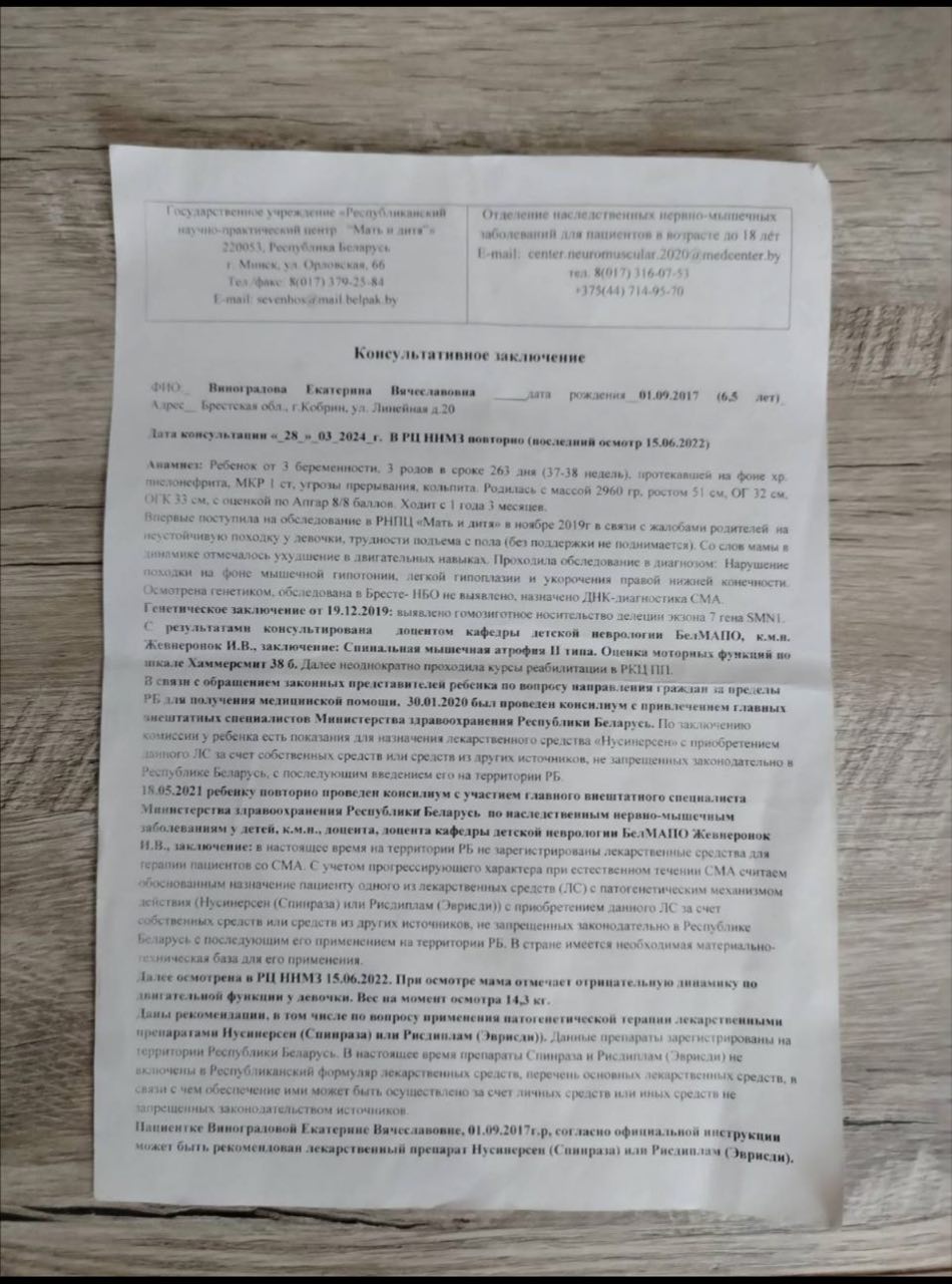 Я – мама Виноградовой Екатерины из г. Кобрина. Моей маленькой доченьке страшный диагноз – СМА 2 типа. Это болезнь, которая убивает мышцы, отнимая у ребенка возможность ходить, двигаться, дышать… Катюша уже не может ходить, ее тело слабеет, и если не остановить болезнь сейчас – она лишится всего. 😭⚠️