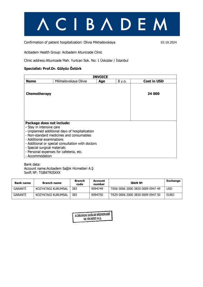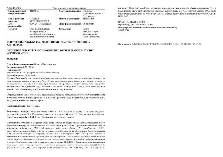 Мы обратились за помощью в Стамбул, где врачи сказали, что есть шанс на спасение — лечение даёт 93% вероятности ремиссии. Но для этого нужно действовать немедленно. Счет за лечение клиника выставила 1.375.000₽, и для нас эта сумма неподъёмная. 😢