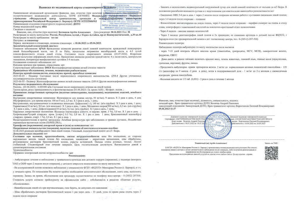 Мой долгожданный и единственный  сын Артём родился со сложной с аномалией развития костей на левой ножке и правой ручке.  Большая степень недоразвития костей выявлены на ножке. 😭🆘Врачи нам поставили диагноз: Аномалия развития костей левой нижней конечности. Продольная эктромелия левой голени, аплазия малоберцовой кости, трехлучевая стопа, деформация большеберцовой кости (это отсутствие кости пятки, трехпалая стопа, отсутствие  малоберцовой кости, ложная большая берцовая кость, разница в ножках 6 см, нестабильный коленный сустав)..😞 Артёмка родился недоношенным 7 месяцев и через час мне сразу сказали, что моего сына не хватает  конечностей костей и пальчиков. Был шок, даже страшно вспоминать, потому что по узи, всё соответствовало по нормам. Почти  спустя  двух месяцев мы лежали в больнице и после выписки и, мы тут же поехали Федеральный центр  травматологии и ортопедии г. Барнаул. Связи с тем, что Артём появился на свет раньше 7 месяцев, нам сказали таких деток лучше оперировать в 6 месяцев. Первую операцию сделали 20.07.2022 года в возрасте 6 месяцев – этап коррекции  деформации левой голени.  Поле операции день и ночь ребенок сын носил  тяжелой гипсовой лангетке, тутор не держался и мы  перетягивали немного эластичным бинтом ножку, чтоб лангетка не спадала. Артемка приспособился ползать прямой ножкой.  Потом  ездили каждый три месяца наблюдались. Вторая  операция   была проведена 02.06.2023 года в  возрасте 1 год 5 месяцев -  коррекции малоберцового малоберцового тяжа и здесь же врач сказал, что деформация стала ещё больше, то есть уходит в сторону, что первая операция,  к сожалению, не дало положительного результата. После второй операции смогли сделать тутор, но также постоянно спадает с ноги, связи с узкостью нижней части ноги и отсутствуем пятки, носим также день и ночь. Я обращалась во множество клиник России (Детский ортопедический институт имени Г.И. Турнера, Федеральный научный центр имени Г.А Альбрехта Санкт - Петербурге, ФГБУ «НМИЦ ТО имени Г.А Иллизарова г. Курган, Центр Травматологии и ортопедии имени Н.Н. Приорова в Москве, Клинику Костанта в Ярославле, НИИ ФЦ травматологии и ортопедии  Новосибирска). Предлагали многочисленные этапы операции,  на протяжении всей его жизни  и не дали гарантии, что ребенок будет  ходить, как поведет себя ножка с аномалией. Не один врач не уверен, что после выпрямления голени, Артёмка сможет на неё наступать, одни говорили, что сложный случай, к сожалению такой родилсяа другие молчали. Я нашла американского доктора спаситель детских ножек хирург – ортопед  ДрорПейли, связалась, с ним и он нам написал, что он успешно вылечил сотни  таких детей с таким заболеванием как у нас!!! Артёмка будет ходить!!!  Прописал план лечения только две операции возрасте, желательно  с 1года 5 месяцев и вторая возрасте  в 10 лет. С помощью благотворительного Фонда «Помоги спасти жизнь» мы попали и 7 февраля 2024 года Доктором Дрор Пейли в клинике Burjeel Medikal City Абу – Даби, проведена комплексная 6 часовая  комплексная операция, которая исправила деформацию стопы и голени, также удлинение стопы и коррекцией пятки в тоже время  удлинили ножку на 6 см. Ребёнок ходит в аппарате немного но ходит, сгибает колено. Доктор Дрор Пейли, установил пластику губчатой кости с внутренней фиксацией  большеберцовой кости, был забран забор 