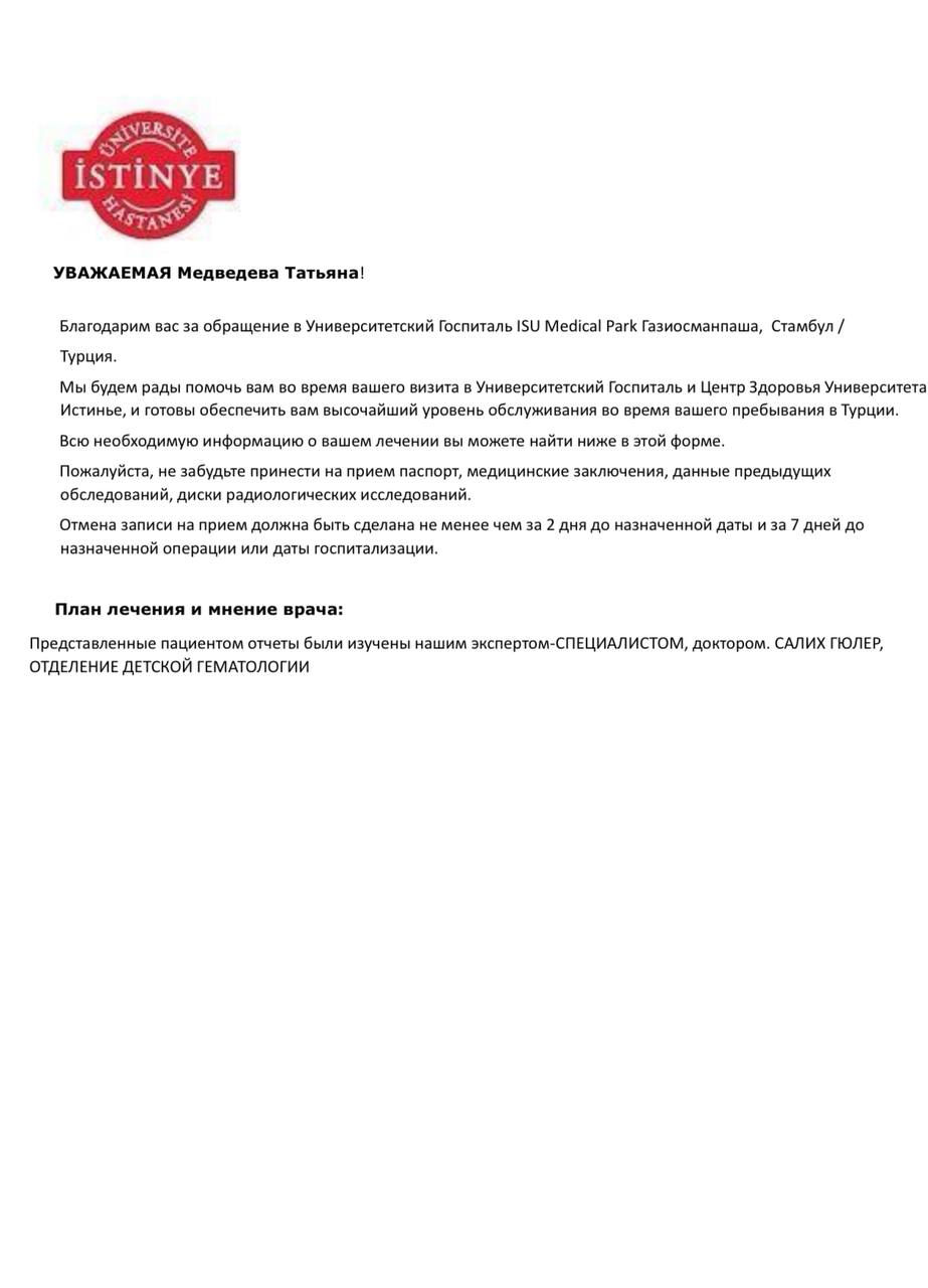 Наши государственные учреждения уже без сильны нам помочь. Но я нашла клинику в Турции, где есть хорошие результаты по излечению нейробластомы. Там нам проведут иммунотерапию и лучевую терапию. Врачи требуют своевременной оплаты для проведения лечения.