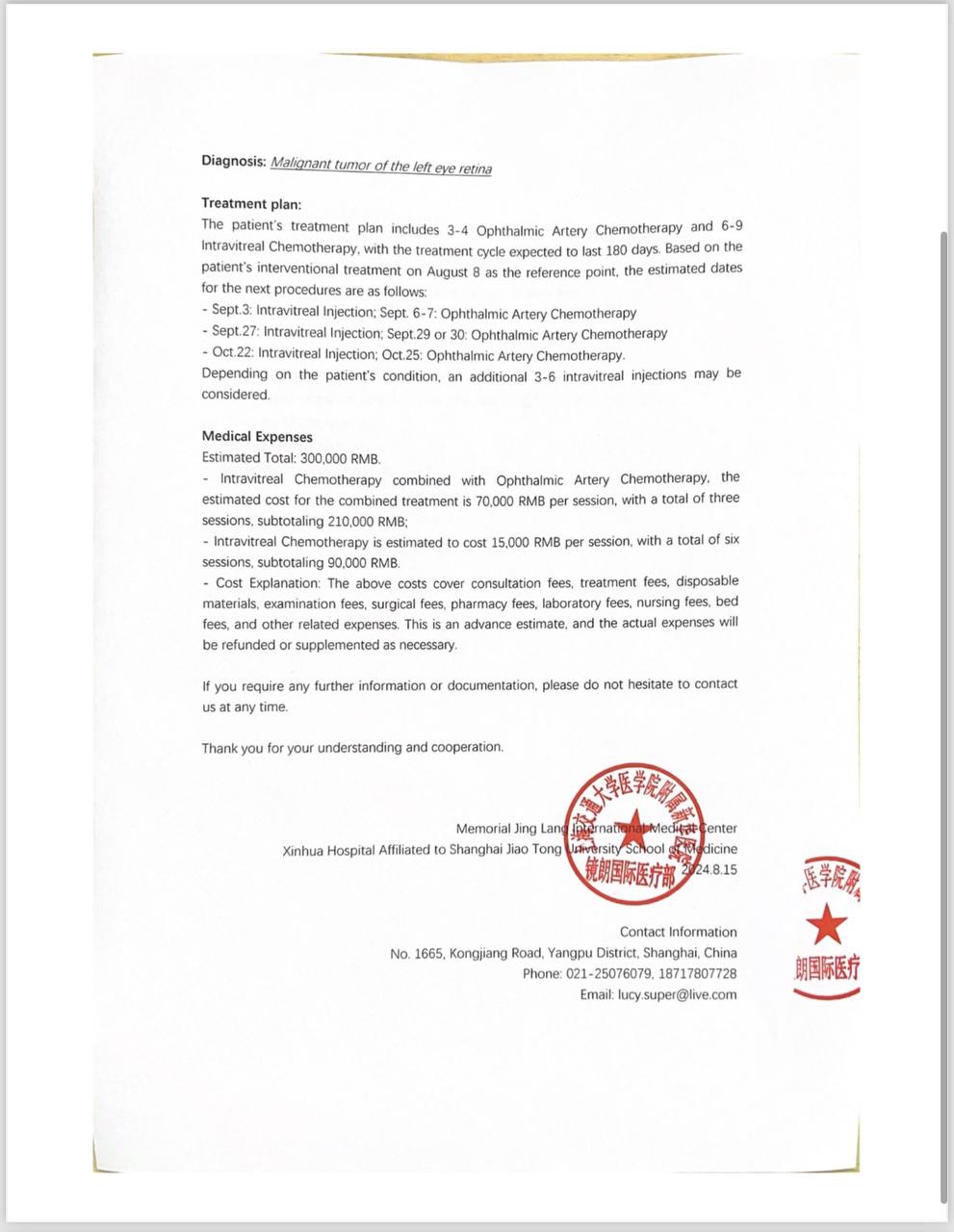 Мама нашла клинику в Китае, где могут сохранить мой глаз и спасти меня! Там мне готовы провести второй курс химиотерапии и лазерное лечение. Но стоимость лечения огромная — 1.591.325 рублей! 😢