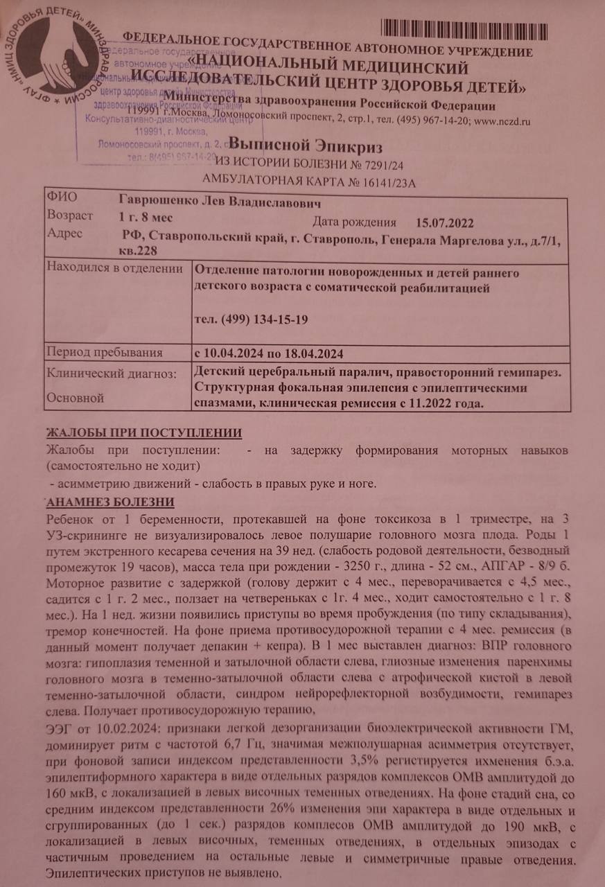 Наша семья уже на пределе своих сил, и мы обращаемся к вам с последней надеждой. Мы не можем больше справляться с этим ужасом и отчаянно нуждаемся в вашей помощи! 💔 Нашему сыну, Льву, всего 2 года, и его жизнь — это борьба, от которой мне хочется кричать от боли. Его реабилитация стоит 100 000 рублей, и мы уже не в силах это оплатить. Все, что мы зарабатываем, уходит на лечение и поддержание его жизни. У нас нет ни одного шанса на нормальную жизнь без вашей помощи! 😞💸 Лев растет, и с каждым днем его состояние становится только хуже. Ему нужны ортопедические изделия, которые мы должны покупать за огромные деньги, так как ИПРА покрывает только часть стоимости. А ещё мы обязаны платить за уколы ботулотоксина, которые нам показаны каждые 3 месяца. Ранее нам их делали бесплатно, но теперь мы должны оплачивать эту процедуру за свой счет, потому что нет другого специалиста. Врачи, к которым мы обращаемся, не могут дать нам гарантии, что Лев когда-то будет как все дети. 😔 Каждые 3 месяца мы проходим дорогостоящие процедуры электроэнцефалографии. И эти расходы просто разрушают нас, а мы не можем больше ни на что рассчитывать, кроме как на вашу помощь. 💔Я, Гаврюшенко Юлия Александровна, забеременела в 27 лет, и наша долгожданная дочь превратила мою жизнь в настоящий кошмар. Мы пережили экстренное кесарево сечение на 25 неделе беременности, когда Лев весил всего 680 граммов. Его спасли чудом! Но и с этого момента началась нескончаемая борьба, и всё, что я видела, когда его родила, — это слабый, едва живой малыш. Он был подключен к аппаратам, и врачи не давали никаких надежд! 😢Только на 7-й день жизни у Льва начались судороги. Мы не понимали, что происходит. Врачи поставили диагноз — ДЦП, правосторонний гемипарез и эпилепсия. Лев каждый день страдает от боли, и ничего не помогает. Мы с мужем держимся за жизнь нашего ребенка, но каждый день — это новая борьба. 💔Лев развивался очень медленно. Он только в 1 год и 8 месяцев сделал свои первые шаги. Он не может ходить нормально, не может нормально работать правой рукой, а его стопы имеют деформации, которые приводят к сильной боли и новым проблемам с суставами. Мы делаем всё возможное, чтобы помочь ему, но без вашей поддержки у нас нет никаких шансов! 😔 Врачи говорят, что у Льва огромный потенциал, но если не пройти реабилитацию, всё это будет напрасно. Мы ежедневно проходим ЛФК, массажи, бассейн, но этого недостаточно. Нам нужно больше, а денег на это нет! Лев нуждается в логопеде и дефектологе, и нам не хватает средств на все эти занятия. Без вашей помощи наш сын не выживет. 😭 Это наша последняя надежда. Мы не можем больше молчать, мы не можем больше страдать в тени. Пожалуйста, помогите нашему ребенку! Он заслуживает шанс на нормальную жизнь. Мы больше не можем бороться одни. Мы не можем потерять его! 🙏С огромной просьбой о помощи,