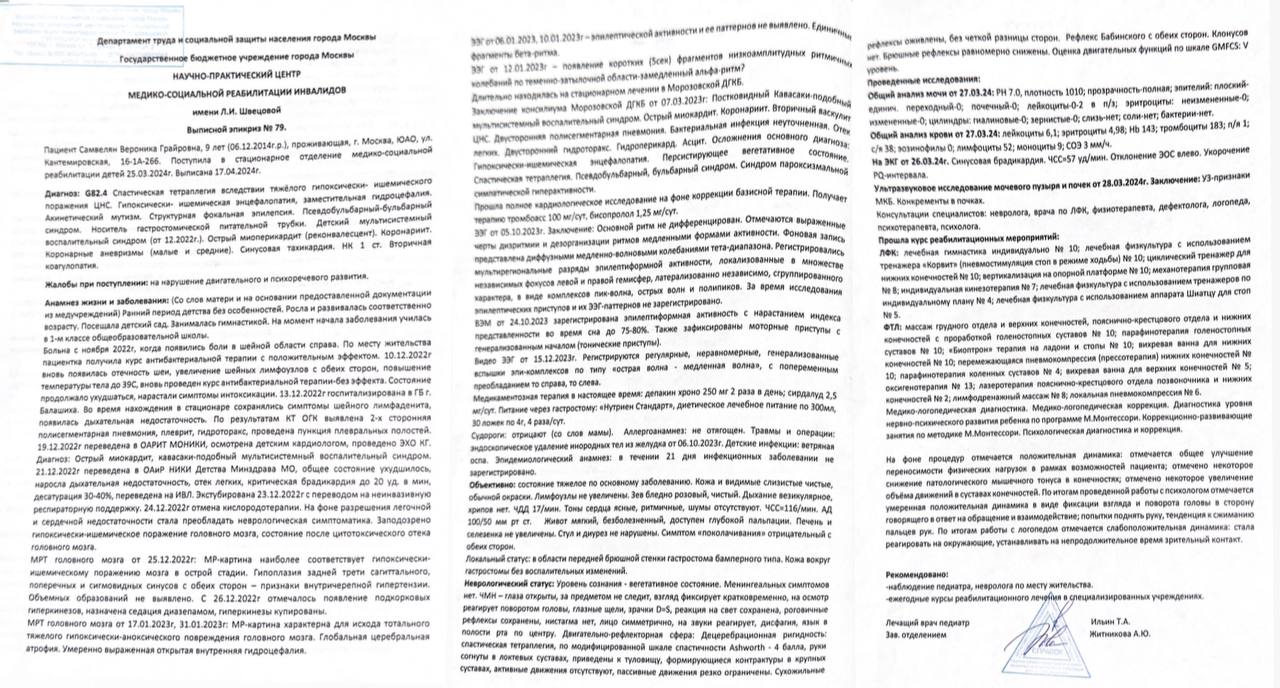 Моя дочь Вероника страдает от ужасных болей, которые не прекращаются уже несколько месяцев 😔💔. Её мучает невыносимая боль в шее, она не может нормально дышать, а температура держится постоянно 🌡️. Я не понимаю, что происходит, но боли всё сильнее, а врачи никак не могут найти точную причину 😞. Сначала было просто воспаление лимфоузлов, но теперь ситуация стала намного хуже. Боль в шее всё усиливалась, и я была вынуждена обращаться к врачу снова и снова 😢. Но никто не хотел брать на себя ответственность 🙅‍♀️. Со временем началась одышка, Вероника жаловалась, что ей не хватает воздуха 🫁. Я начала паниковать, но врачи продолжали уверять, что это не опасно. Но боль не отпускала, и вскоре у неё начали отказывать органы 😱. Нас госпитализировали, и состояние только ухудшалось. После множества анализов и обследований выяснилось, что в её плевральной полости скопилась жидкость, началось воспаление лёгких 💔. Но этого оказалось мало. Поставили диагноз — острый миокардит, и сердце девочки больше не справлялось 💔💔. Через сутки её перевели в реанимацию. Вероника была подключена к аппарату ИВЛ, её вели в медикаментозный сон, но на следующее утро её не смогли вернуть в сознание 😞. Она впала в глубокую кому, а её мозг начал отекать 🧠. Нашу жизнь разделили на «до» и «после». Весь мир, в котором мы жили, рушился в одно мгновение 🌪️. Все эти мучительные дни я держалась, но ничего не могла сделать 😢. Мы прошли через несколько больниц, через множество процедур, надежда на выздоровление была лишь небольшим проблеском среди мрака 🌑. Ника начала реагировать на голос, пытаться смотреть в глаза — это было единственным светлым моментом 🌟. Она вернулась к нам, но нам предстоит ещё долгий путь восстановления 💪. Мы отчаянно просим вашей помощи! 🙏 Без вас мы не сможем оплатить реабилитацию, которая так нужна Веронике, чтобы она могла вернуться к жизни 🌈, научиться снова двигаться, говорить, играть, а не страдать от боли. Каждая минута важна, времени у нас совсем мало ⏳💔.