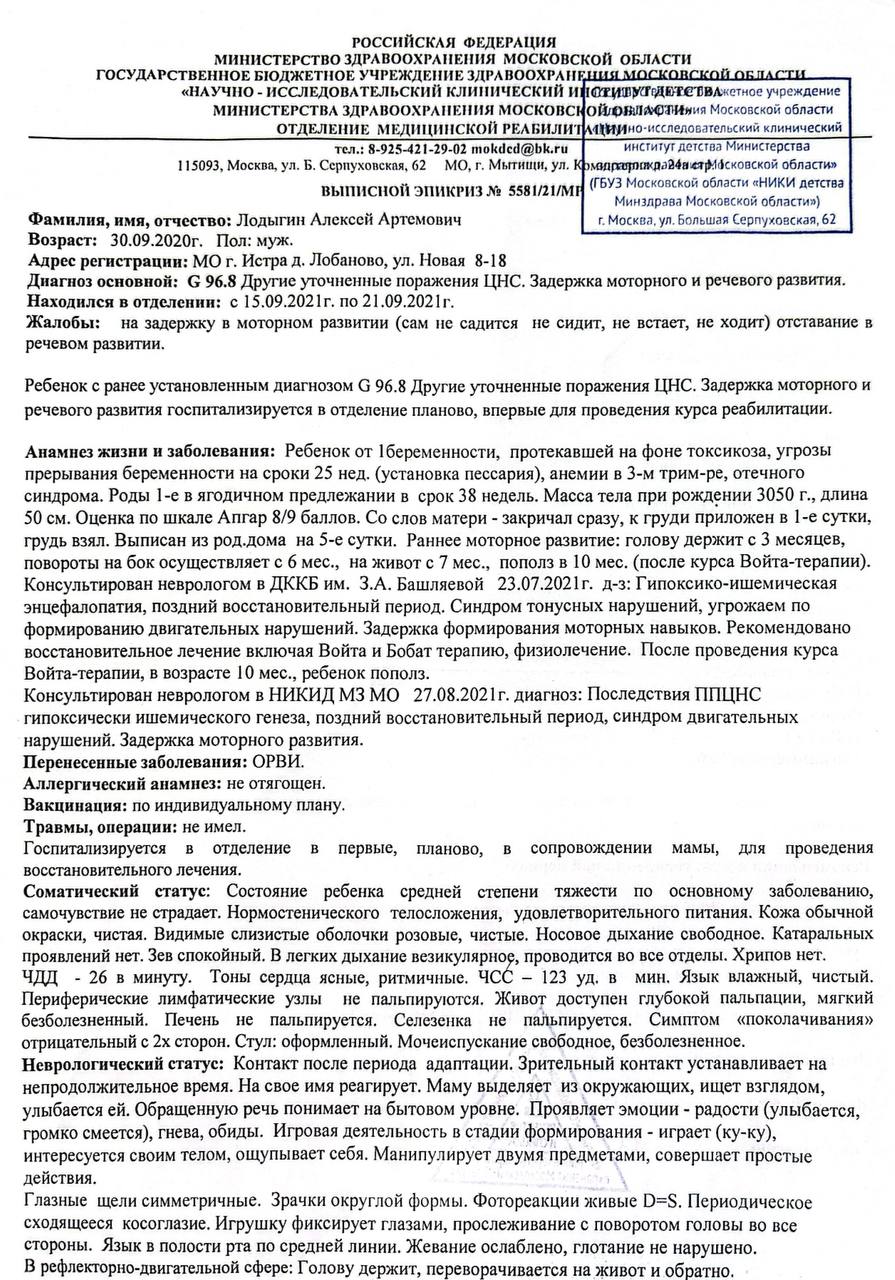 Здравствуйте, меня зовут Лодыгина Анна. Обращаюсь к вам с просьбой о помощи для моего сына Лодыгина Алексея, 4 года. У Леши детский церебральный паралич, спастическая диплегия. GMFCS II уровень. А также задержка речевого развития, моторная дизартрия. Оформлена инвалидность. Алексей родился в срок, вовремя стал держать голову. После 6 месяцев мы заметили задержку моторного развития. Леша не сел и не пополз в нужный срок.  Диагноз ДЦП поставили после года, когда уже стало понятно, что он сильно отстает в моторном и психическом развитии. У Леши наблюдалась сильная спастика.  В 2,5 года мы были на консультации у нейрохирурга Зиненко в НИКИ Педиатрии им. Вельтищева. Он рекомендовал для устранения спастики сделать операцию СДР. Но неврологи настояли подождать и попробовать сначала ботокс. После 2х уколов ботокс держался только месяц. Алексей мог делать шаги сам, но последнее время тонус сильно нарос и сейчас Алексей ходит с поддержкой, за руку. В мае 2024 года мы прошли врачебную комиссию в НИКИ Педиатрии им. Вельтищева, которая установила, что Леше необходимо проведение операции СДР. Операция запланирована на 24 февраля 2025. Для того, чтобы операция дала наилучший эффект, после нее очень важно пройти качественную реабилитацию. После операции Леше придется буквально заново учиться пользоваться ногами, в которых уже не будет спастики. После операции его ждут на реабилитацию специалисты центра «Адели» в г. Пенза, у них есть большой опыт реабилитации детей после таких операций. К сожалению, такую реабилитацию можно пройти только платно. Стоимость курса составляет 312 400 р. Для нашей семьи это огромная сумма, которую мы не можем оплатить самостоятельно. До операции уже остается совсем мало времени и мы понимаем, что своими силами справиться у нас не получится. Без помощи благотворителей нам не обойтись! У нас полная семья. Мы живем в своей небольшой квартире в г. Истра Московской области. Все свободные средства мы тратим на оплату реабилитаций и занятий Леши.  Леша любит играть с динозаврами, лепить, вырезать, ходить в детский сад и на музыкальные занятия. Хорошая реабилитация после операции даст ему хороший шанс научиться ходить самостоятельно. Леша сможет практически не отличаться от обычного ребенка. Просим вас по возможности помочь Леше с оплатой реабилитации!