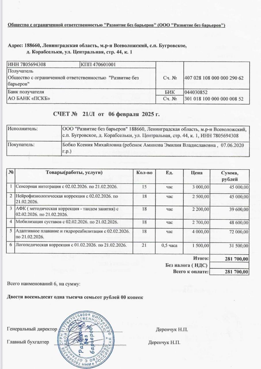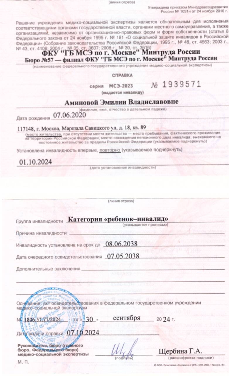 Здравствуйте! 😊 Меня зовут Бобко Ксения Михайловна, мне 23 года (18.07.2001 г.р.), и я мама Эмилии Владиславовны Аминовой, ей 4 года (07.06.2020 г.р.) 💖. У нашей девочки диагноз — ДЦП (спастическая диплегия) 🚶‍♀️.Все началось на 26 неделе беременности, когда я заболела тяжелой формой коронавируса и получала серьезное антибактериальное лечение 😷. Это, к сожалению, привело к преждевременным родам на 30 неделе беременности. Эмилия родилась очень маленькой, 42 см и 1520 г. 👶 Она сразу была подключена к аппарату ИВЛ, так как не могла дышать самостоятельно, а также случилось кровоизлияние в головном мозге, которое повлекло за собой тяжелые последствия в двигательном развитии 🧠💔. В роддоме мне сказали, что ребенок будет инвалидом, но я не согласилась с таким прогнозом 💪. С того момента я ежедневно борюсь за здоровье Эмилии, и самое главное — у неё сохранный интеллект 🧠✨.Моя девочка, несмотря на все трудности, хочет жить как все дети — играть, бегать, прыгать, ходить в садик и вести обычную жизнь 🌸. Но ей приходится быть взрослой и сильной, а я делаю все возможное, чтобы помочь ей идти вперед. Мы прошли множество процедур: массаж, ЛФК, СМТ, электрофорез, теплолечение, рефлексотерапия, Войта-терапия, виброплатформа Галилео, ИППА-терапия, занятия на тренажерах, гидрореабилитация, кинезиотерапия, ботулинотерапия 💆‍♀️💪, занимались с остеопатом, гомеопатом, дефектологом и психологом 🧠. Положительная динамика наблюдалась до 2 лет, а потом все остановилось на месте ⏸️.Каждый день в домашних условиях мы занимаемся гимнастикой, развиваем моторику, логику, память, межполушарное развитие 🏋️‍♀️. Мы не останавливаемся и продолжаем работать над каждым шагом. Также мы начали проходить курсы реабилитации в частных центрах, таких как реабилитационный центр ООО «Развитие без барьеров» в Санкт-Петербурге и Ногинске 🌍.В год у нас до 8 различных реабилитаций — бюджетных и платных. Я стараюсь вывести Эмилию из этого состояния, помочь ей облегчить будущее 🌈. Самые хорошие результаты мы увидели после реабилитаций в РЦ «Развитие без барьеров» 🏅. Здесь Эмилия учится стоять, ходить, контролировать равновесие и развивать вестибулярный аппарат 💪. Занятия по сенсорной интеграции и АФК учат её быть выносливой и развивают мозг, создавая новые нейронные связи, которые могут компенсировать поврежденные области после кровоизлияния 🧠💥.Но Эмилия до сих пор не может передвигаться самостоятельно и обслуживать себя 😔. Чтобы поддерживать достигнутые результаты, ей необходимы постоянные курсы реабилитации — не менее 4-х раз в год 🌱. Стоимость одного курса составляет 281 700 руб. 💸 Для нас это просто неподъемная сумма. Я воспитываю и материально обеспечиваю дочку одна 💕. Я не работаю, так как весь мой день посвящен уходу за Эмилией 👩‍👧. Мы оказались в безвыходной ситуации и очень нуждаемся в вашей помощи 🙏. Мы просим вас помочь нам с оплатой курса реабилитации, и будем безмерно благодарны всем, кто откликнется на нашу просьбу 💖.Спасибо вам огромное за внимание и помощь! 💞 Каждый вклад — это шаг к улучшению жизни моей девочки 🌟.