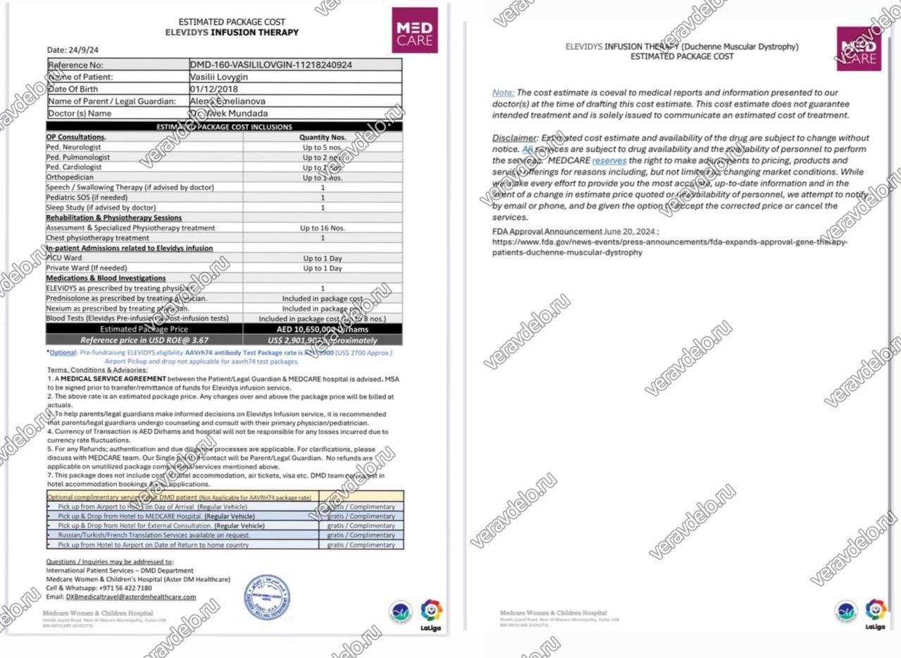 Единственный шанс для нас — лечение в Дубае 🇦🇪, в Medcare Women & Children’s Hospital. Клиника готова принять нас, но стоимость — 2 945 500 рублей. 😭 Для нас эта сумма неподъёмна, а время уходит. Если Вася сядет в инвалидное кресло, лекарство уже не поможет! 🕯️💔